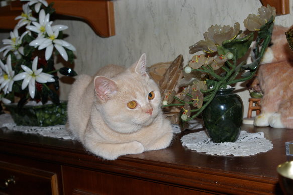 Dexter unser neues Katerchen ( Kater muß er noch werden ) in der Farbe cream, ist im Juni bei uns eingezogen, und hat sich sehr schnell bei uns eingelebt. Er versteht sich mit allen Vierbeinern gut. Er ist ein Sonnenkind ( und ein Sonnenschein ) sein cream ist schön hell und ohne Geisterzeichnung. Er hat Blutgruppe B und so kann ich ihn für jede Katze zum verpaaren nehmen, auch kommen durch ihn andere Lienien in unsere Zucht. Nun muß er aber erst mal erwachsen werden, und dann kann er bei uns für Nachwuchs sorgen. Nochmals ein danke an Frau Tonsen, das sie uns diesen Wonneproppen überlassen hat.